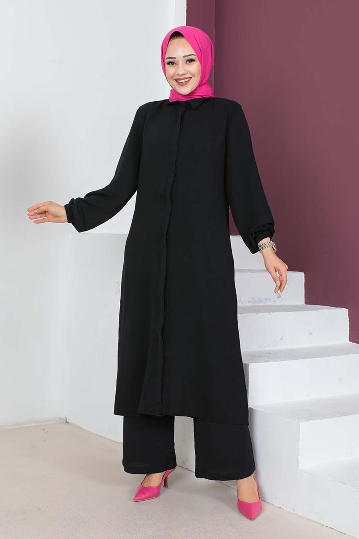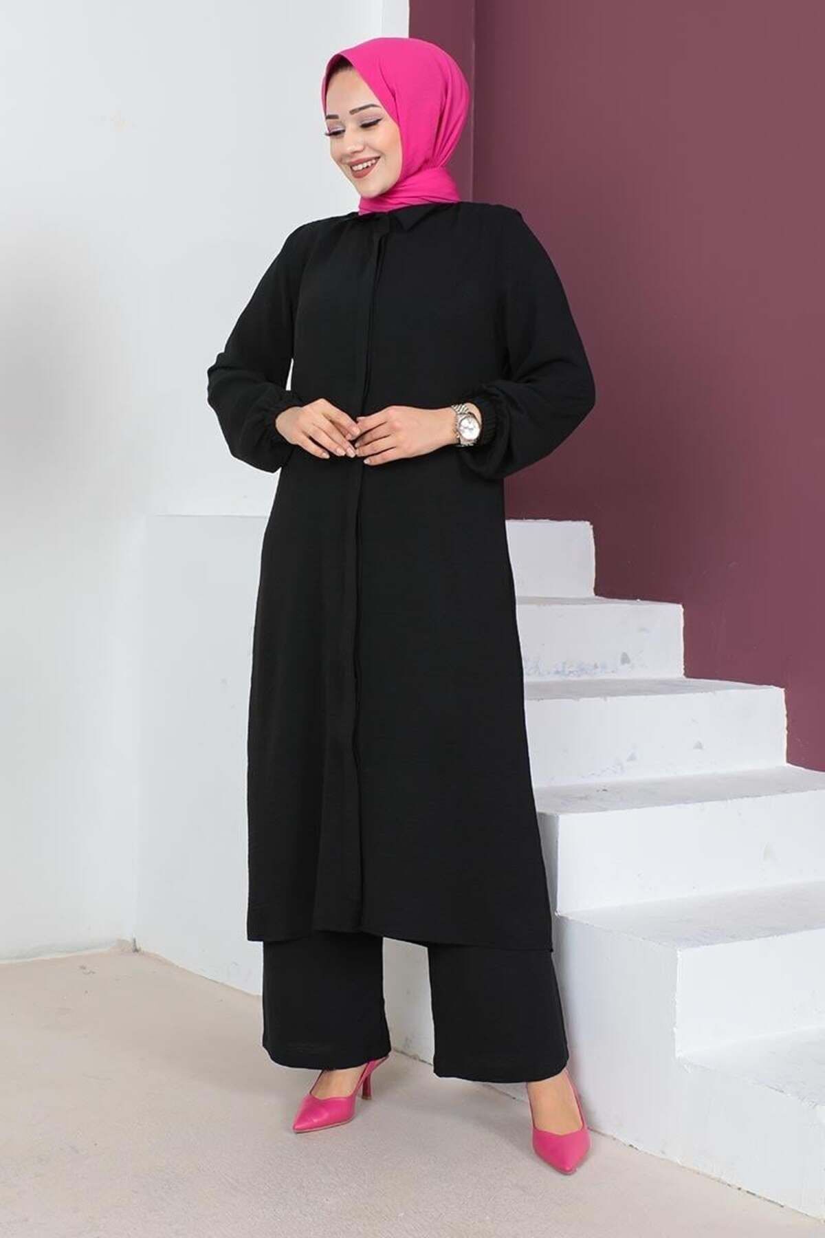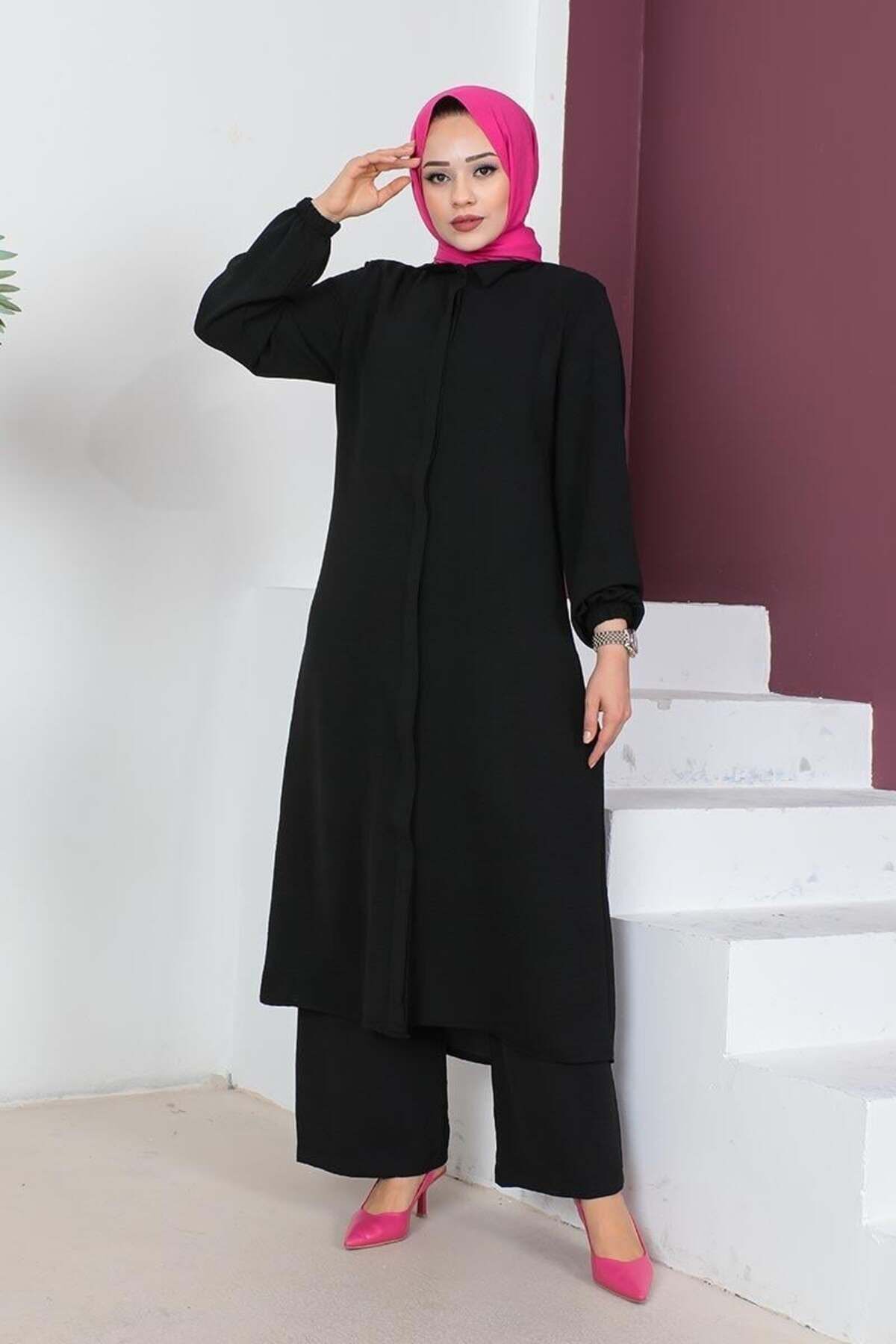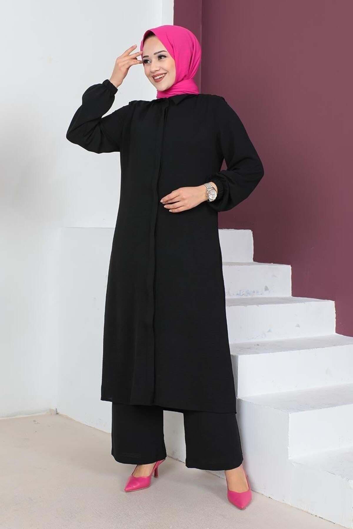 Gömlek ve pantolon olmak üzere iki parçadan oluşan alt; üst takım, şık ve modern bir görünüm sunar; Örme kumaş yapısı ile konforlu bir kullanım sağlar ve orta kalınlıkta olması mevsim geçişlerinde ideal bir tercih olur; Düğmeli detaylar, klasik ve zarif bir stil yaratırken, düz deseniyle kolayca kombinlenebilir; Pamuklu materyali sayesinde cildinize nefes aldırır ve gün boyu rahat etmenizi sağlar; Uzun boy tasarımı ile tesettür giyim koleksiyonuna uygunluk gösterirken, gömlek yaka detayı resmiyeti korur; Boru paça pantolon kesimi modern bir siluet çizerken, normal bel yüksekliği günlük kullanım için idealdir; Uzun kol boyu ve casual tarzıyla her ortamda rahatlıkla tercih edilebilir; tüm yaş gruplarına hitap eder;