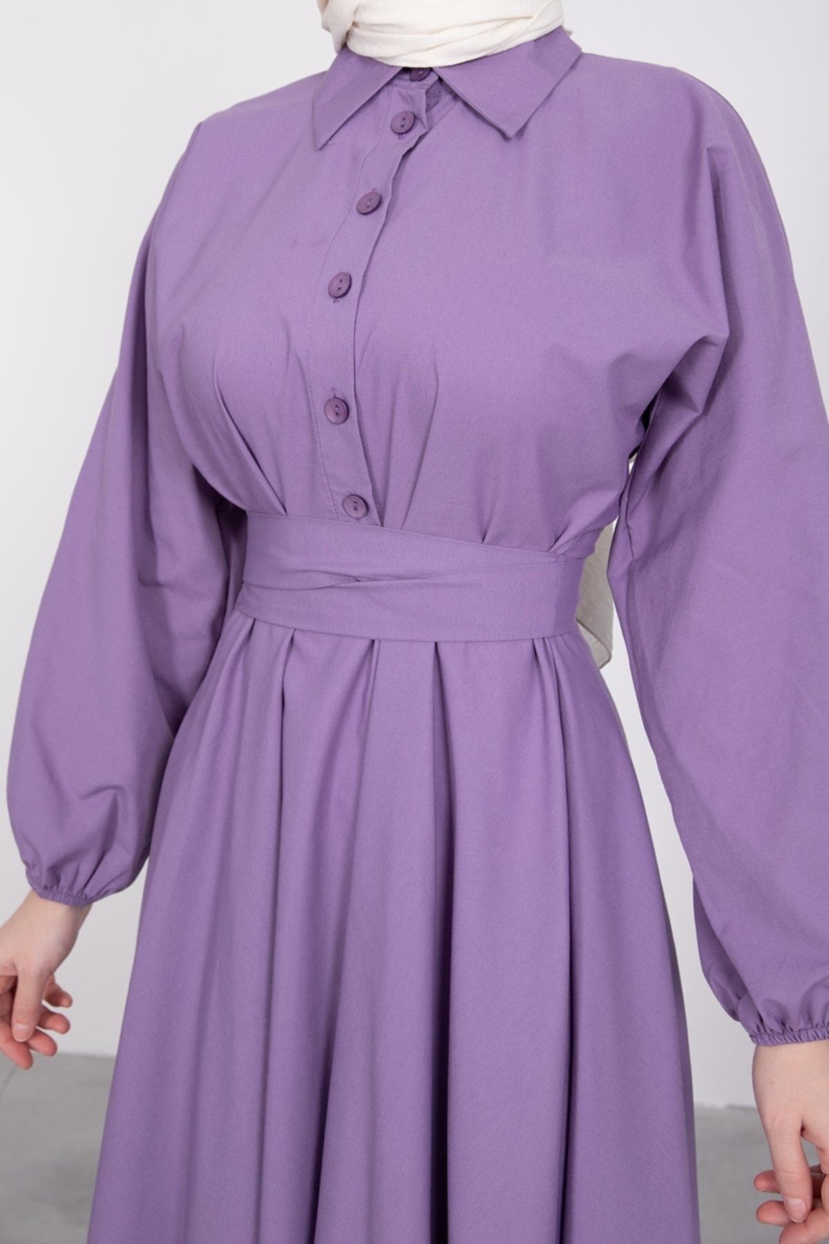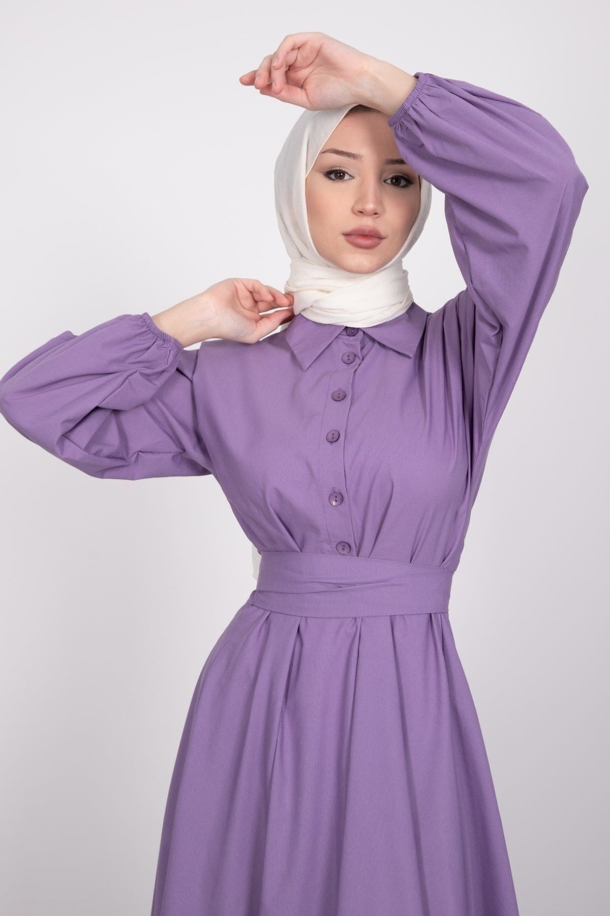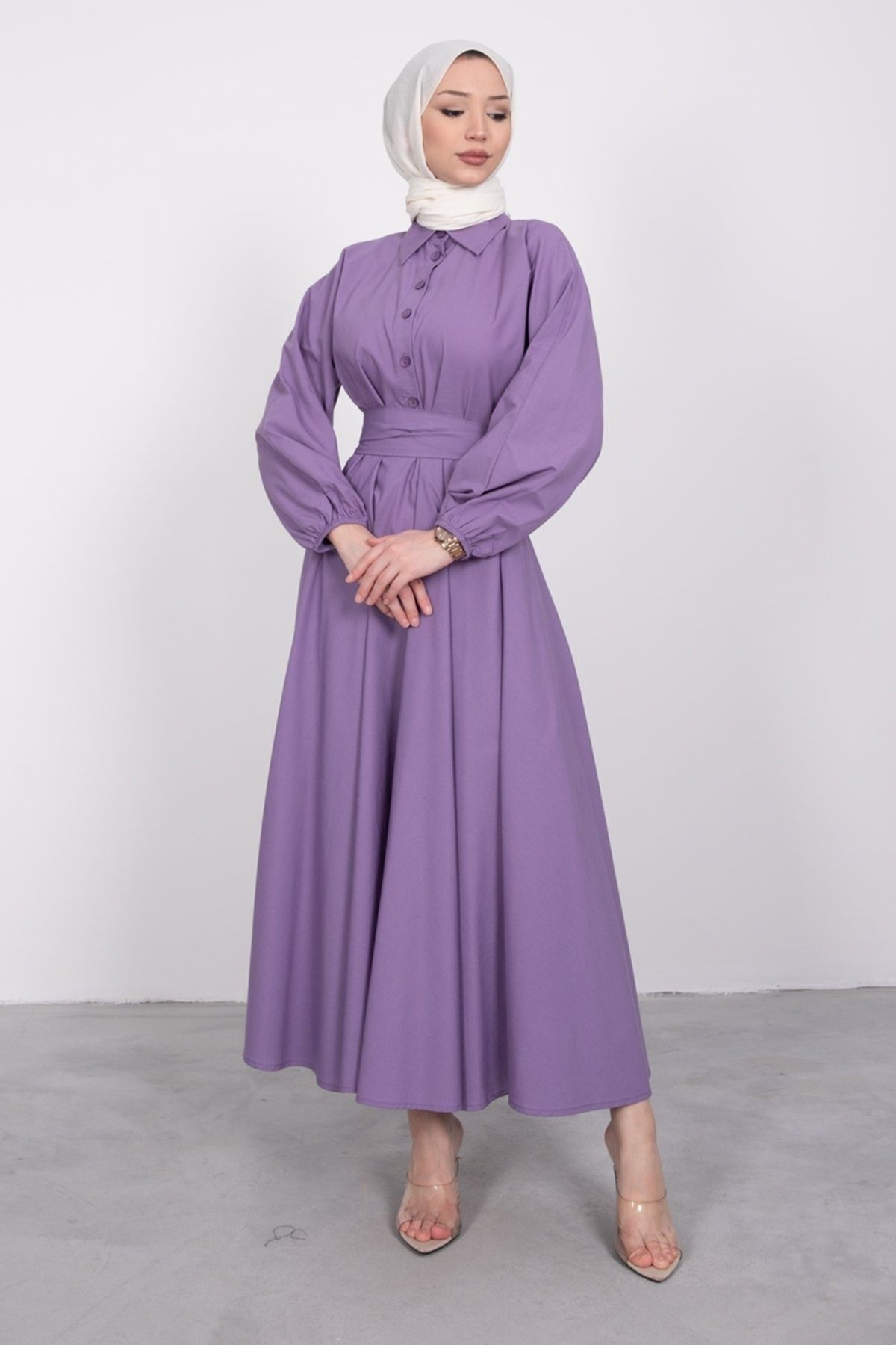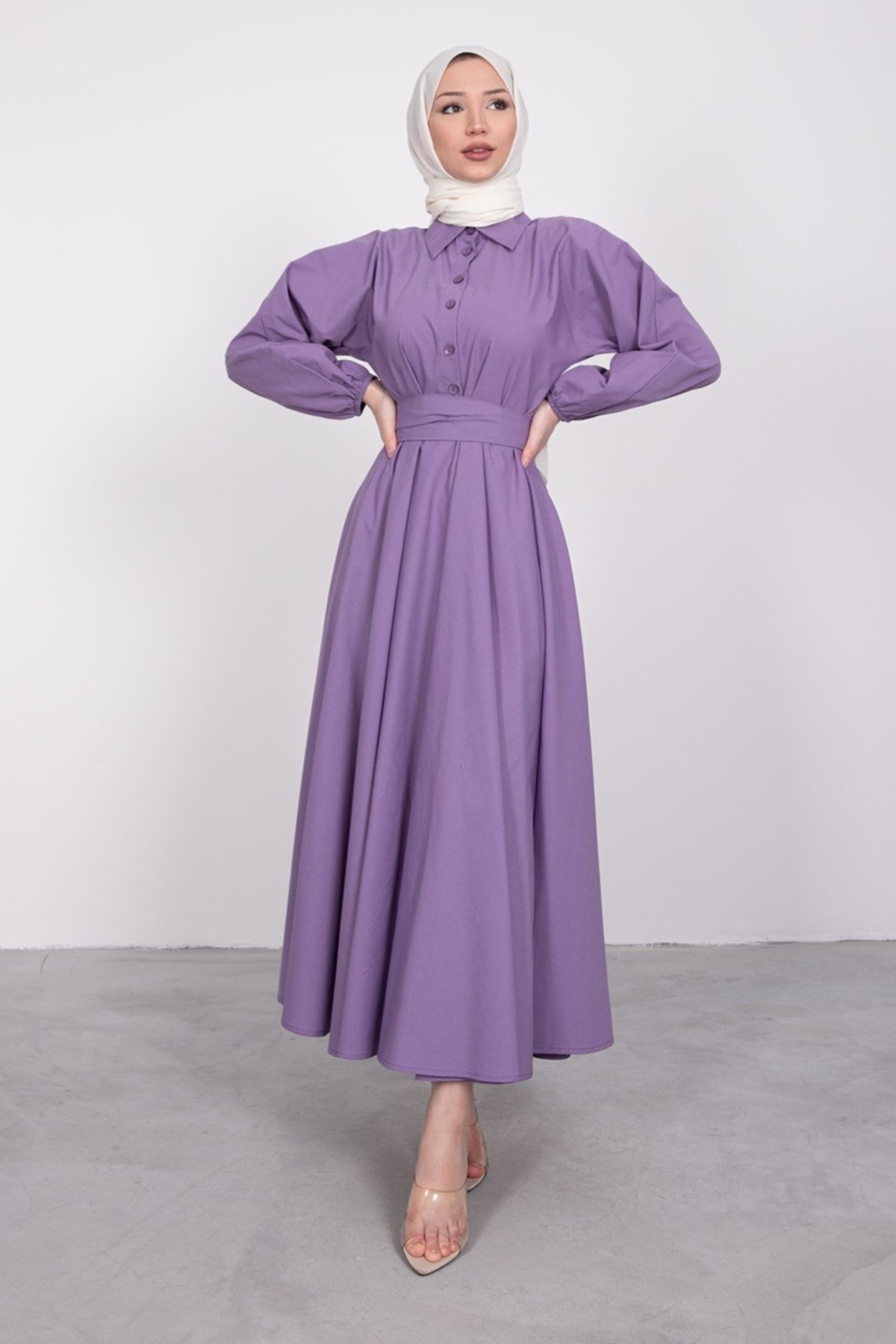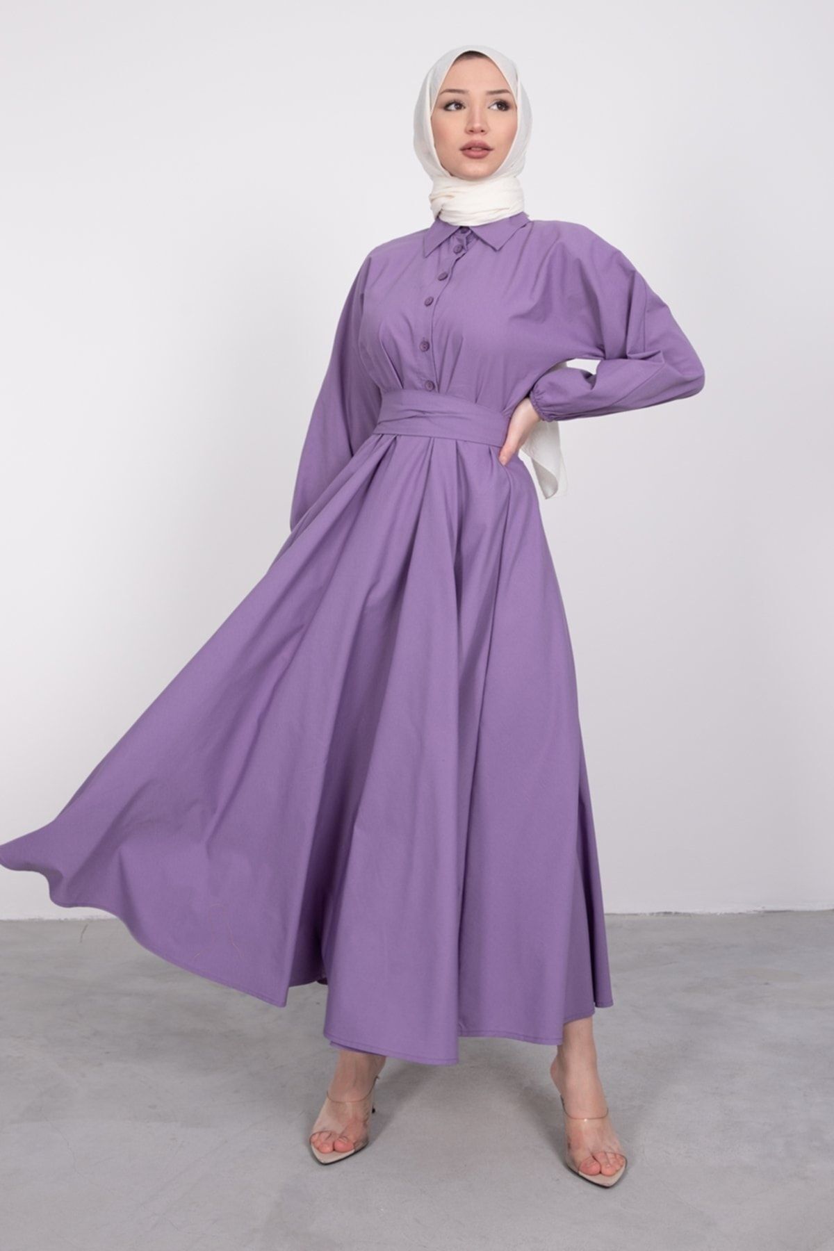 Düğmeli Gömlek Yaka Kloş Tesettür Elbise