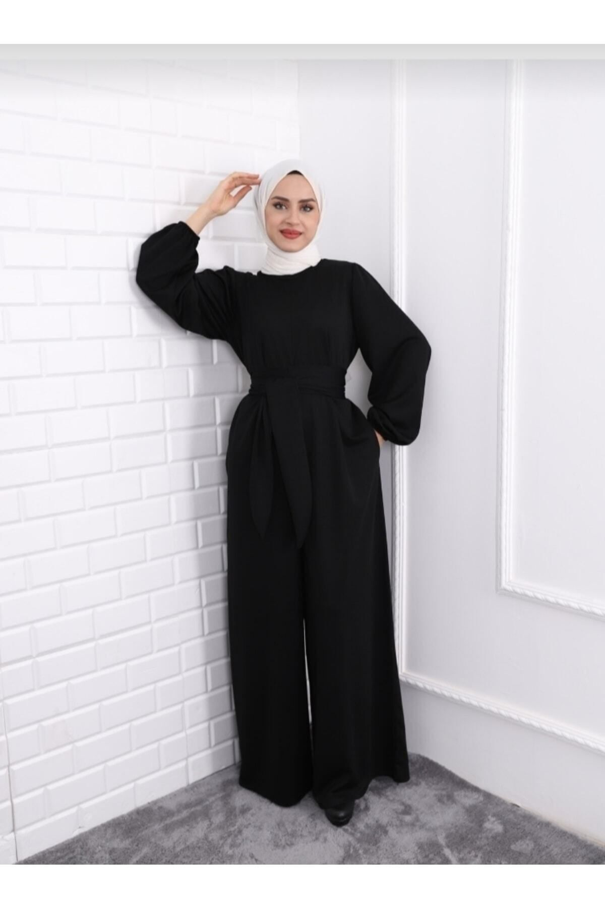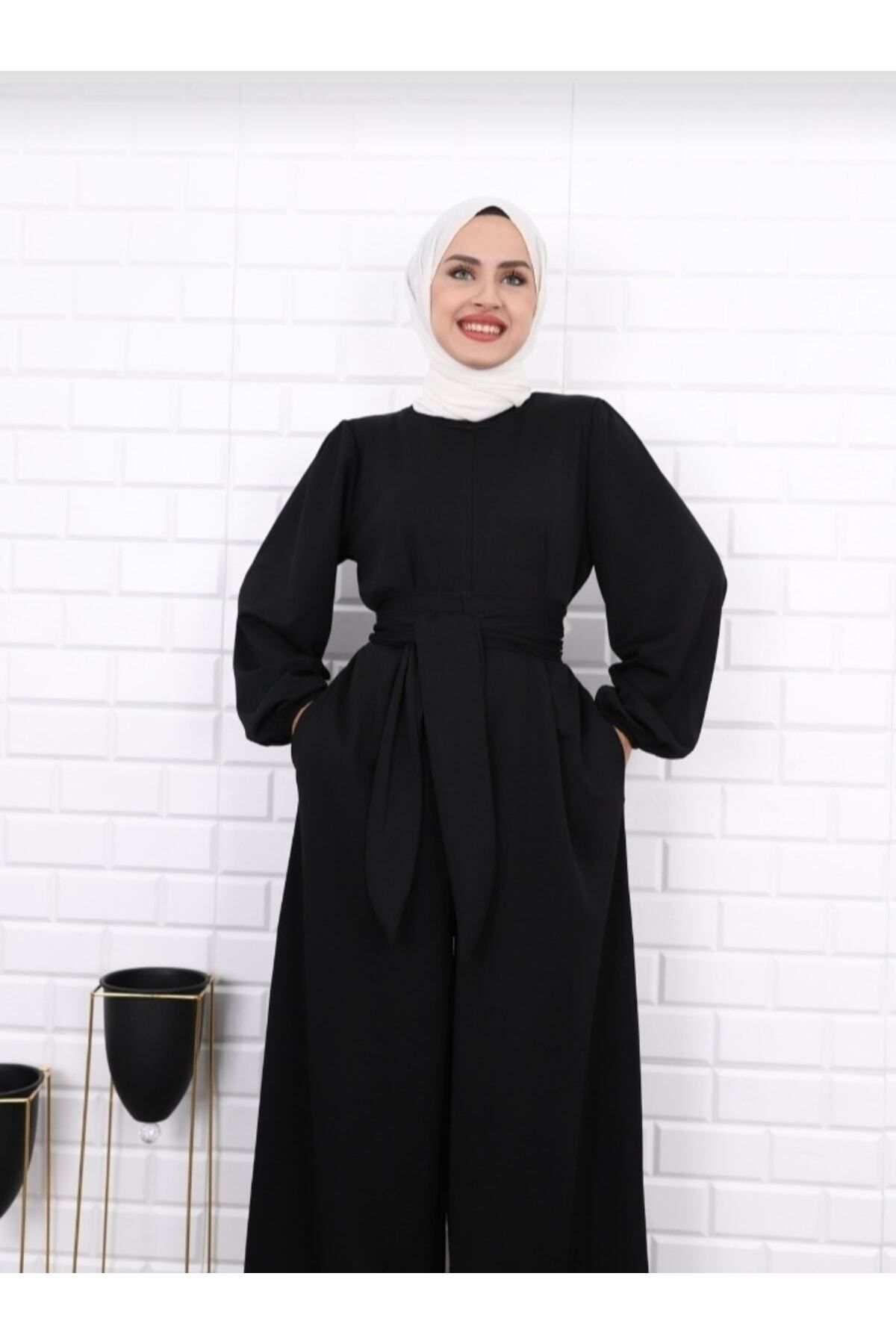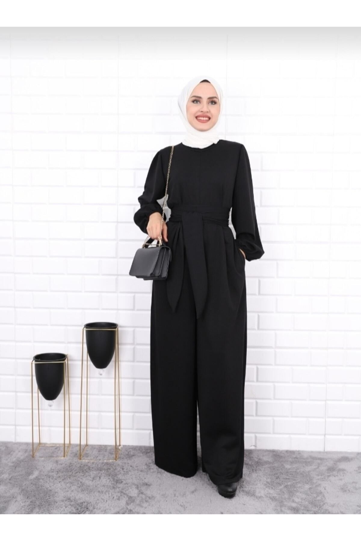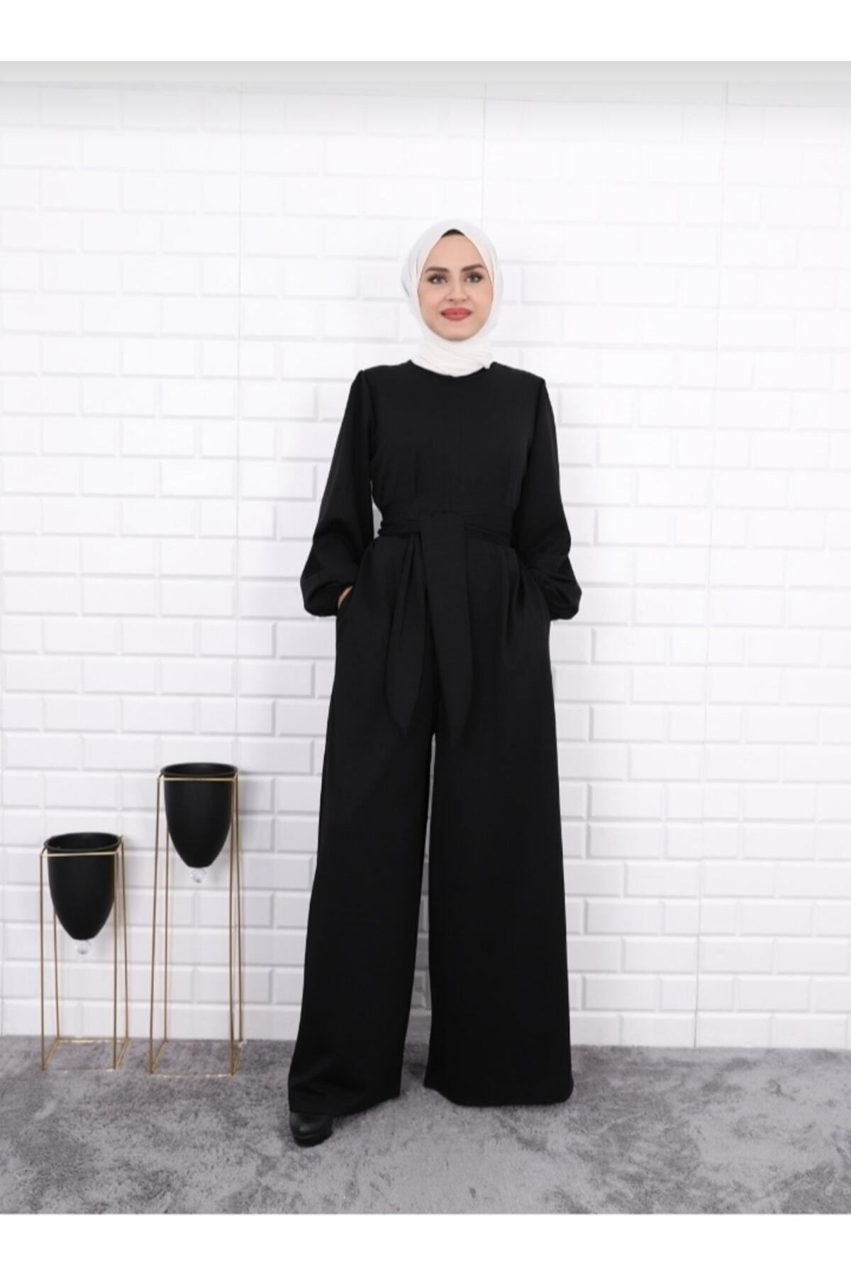 Geniş kuşak dolamalı tesettür tulum rahat kesim fermuar kapamalı krep kumaş