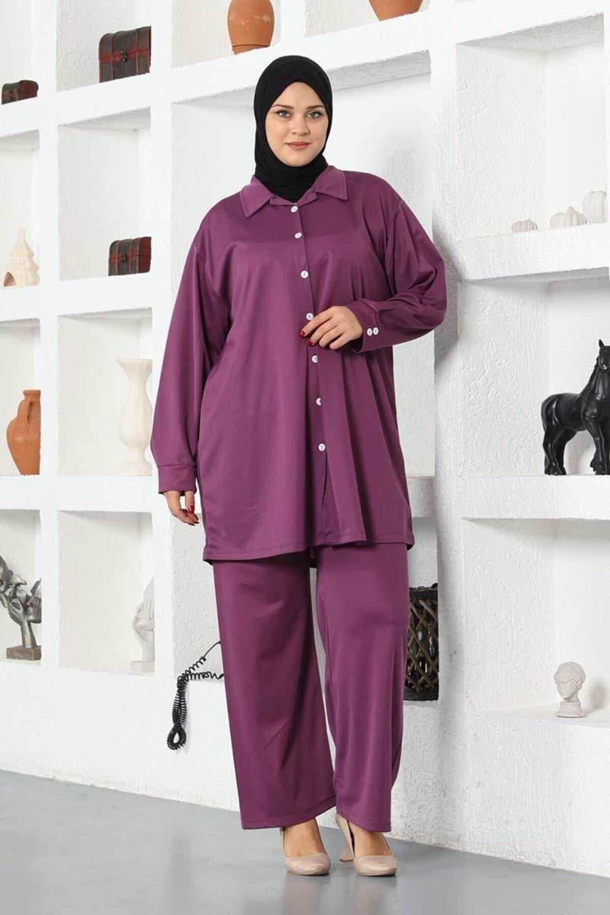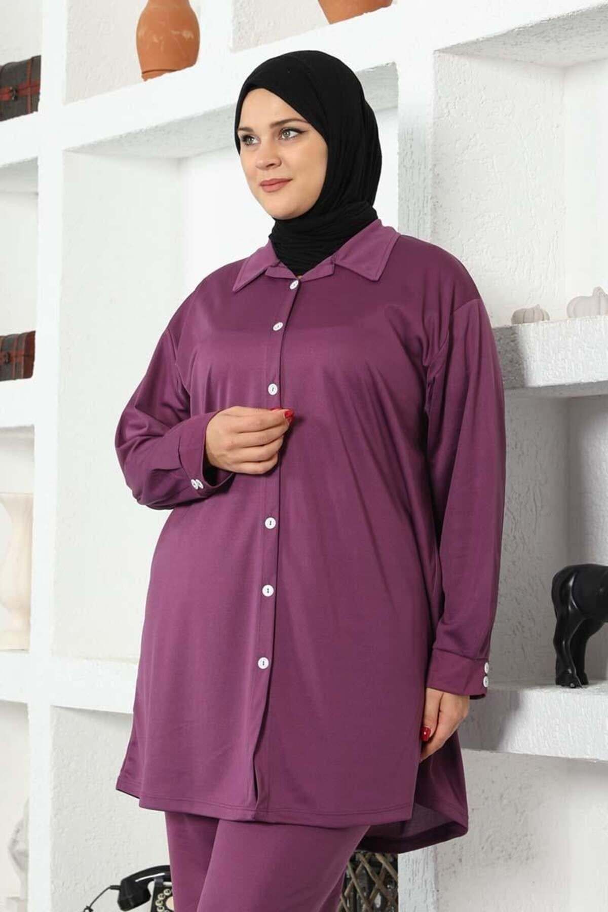 Kadın Büyük Beden Double Örme Gömlekli Takım Mor